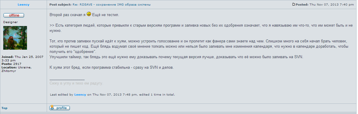 yogev_ezra « Sun Oct 20, 2013 4:30 pm » Leency: Да блин, ты хороший дизайнер и неплохой программист (как программист был хуже, но значительно улучшился). У меня проблема, что ты назязываешь свой дизайн мне (и всем остальным), а не то, что дизайн плохой. То же самое делает Google, например: постоянно меняет внешний вид GMail и заставляет меня заново учиться пользоваться новым интерфейсом и привыкать к новому внешнему виду.